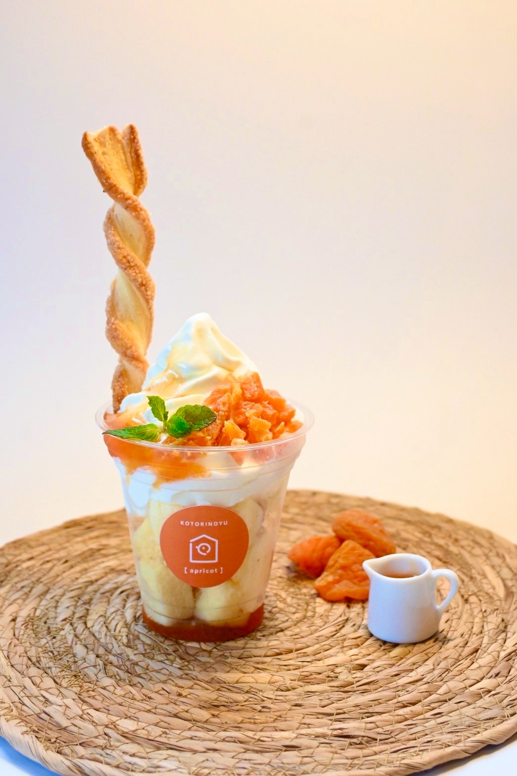 松代産あんずジャムと、長野市松代町の老舗「蔦屋本店」の特製スポンジ・シュガースティックパイを使用した、甘酸っぱさと見た目のかわいらしさを楽しめるオリジナルパフェです。
